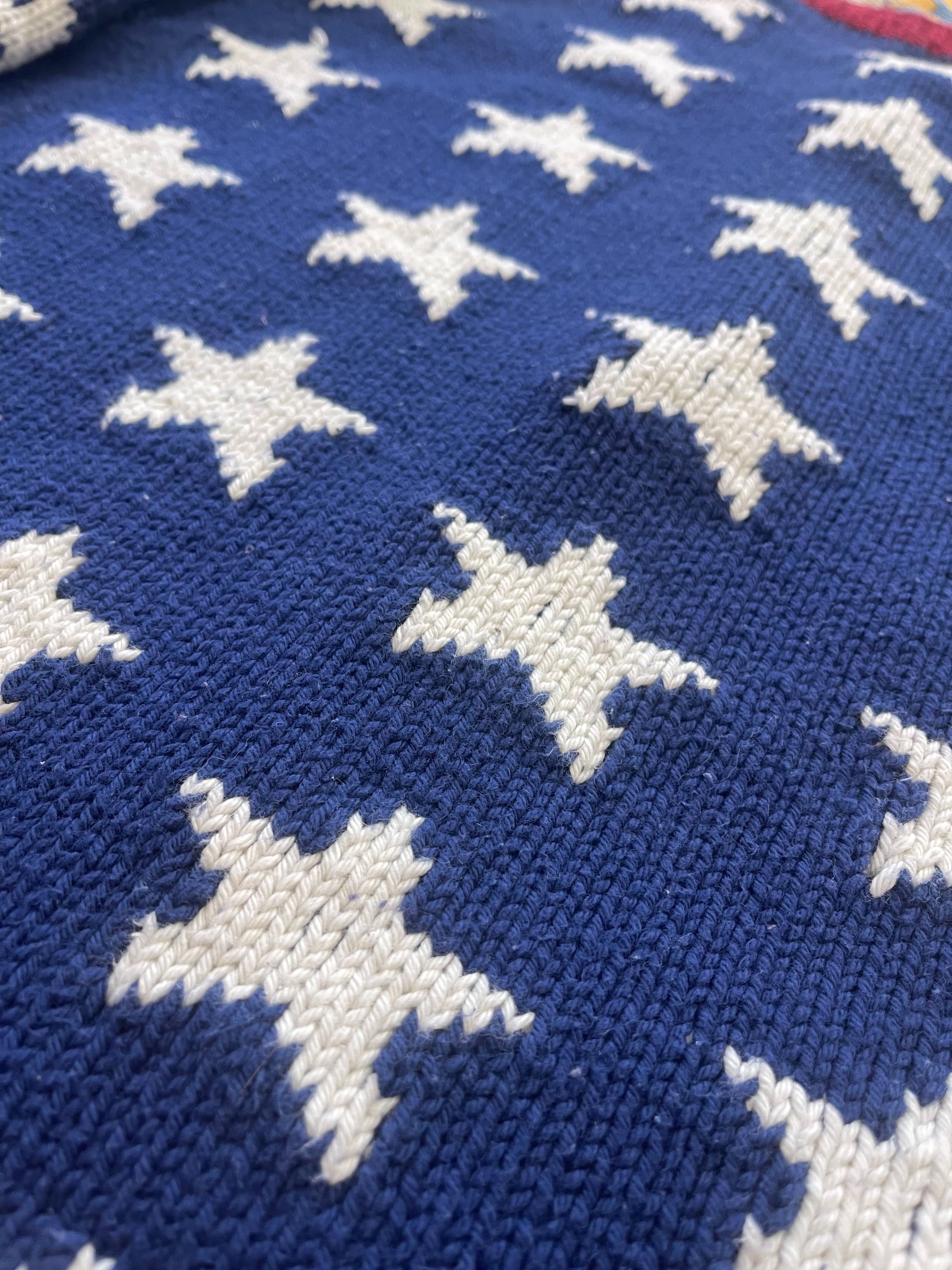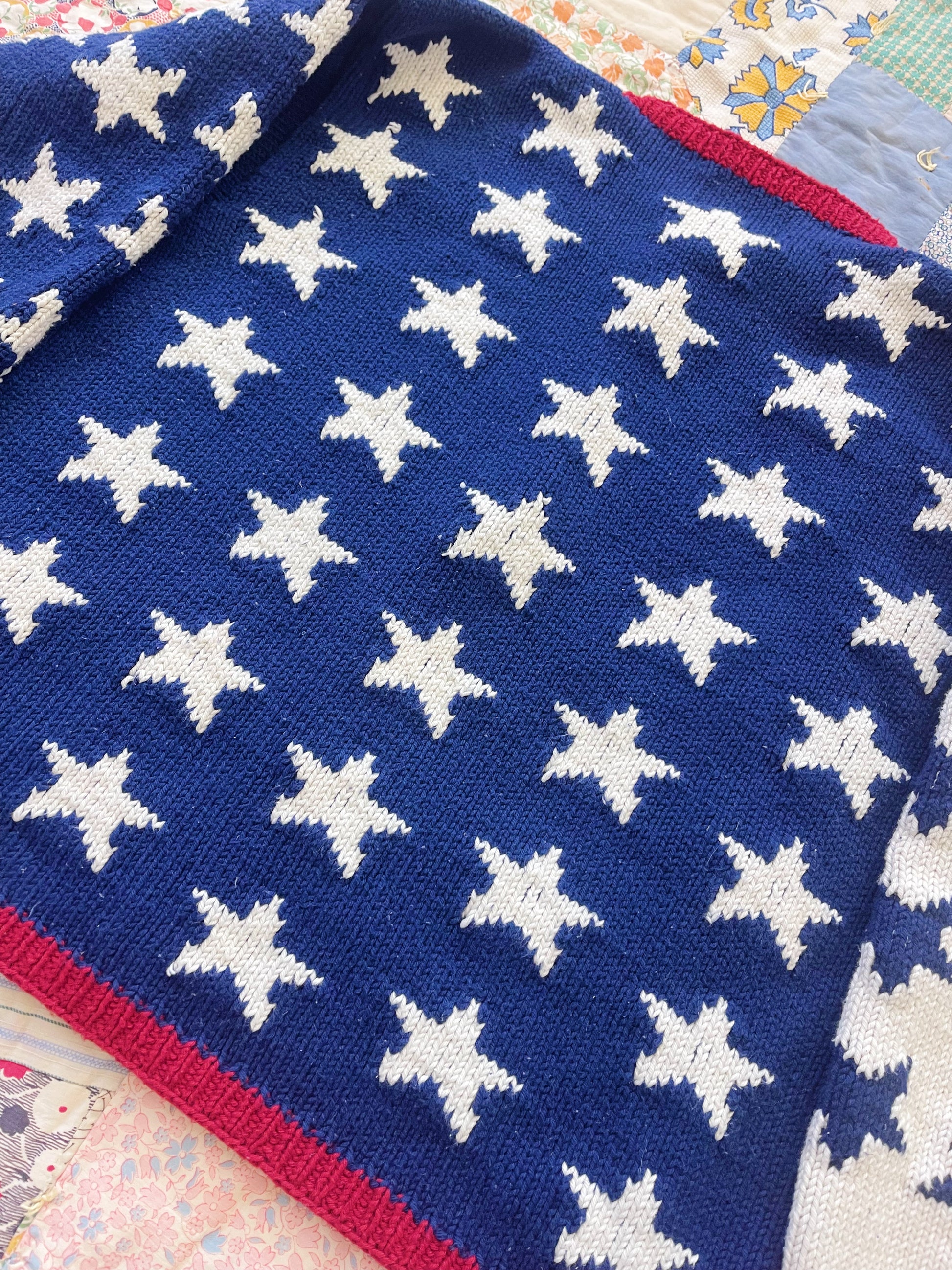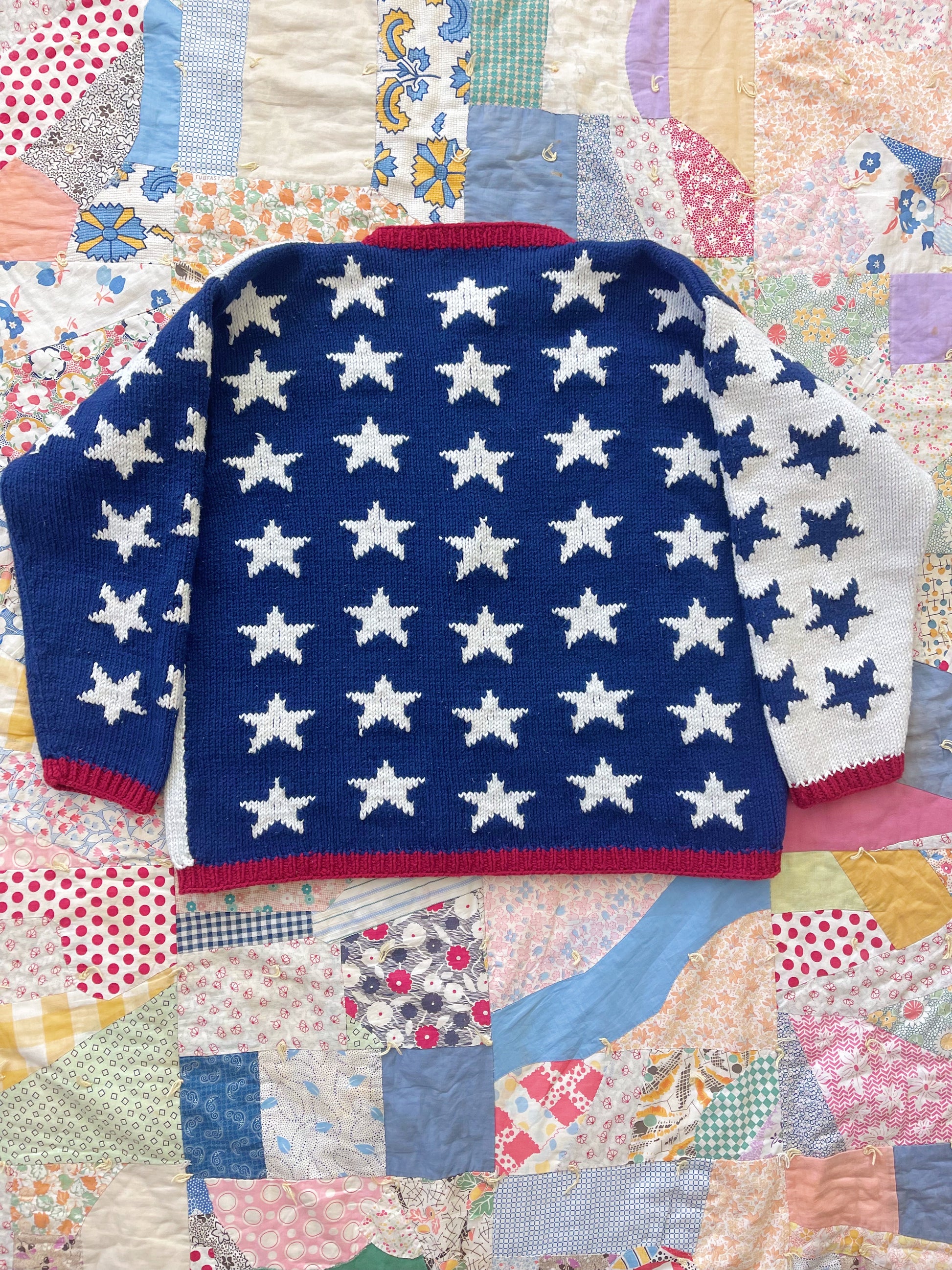 星条旗だとしたらボーダーがあるんだろうと思うのですが、ボーダーが無くてもなんと無くこちらのデザインはアメリカンな雰囲気をムンムンに感じるかわいい星のハンドニットカーディガン☺︎