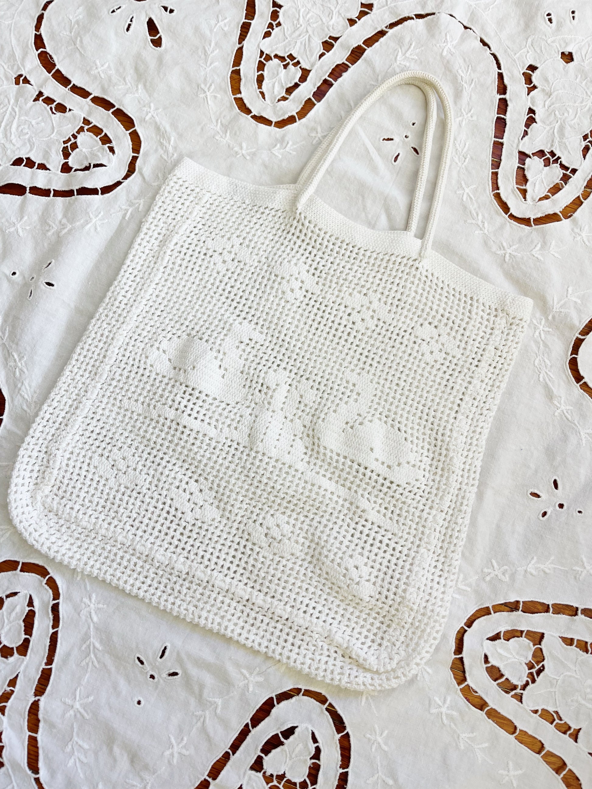 フロントとバックにスワンモチーフが向かい合っているとっても可愛らしいクロシェットのハンドバッグ♡
