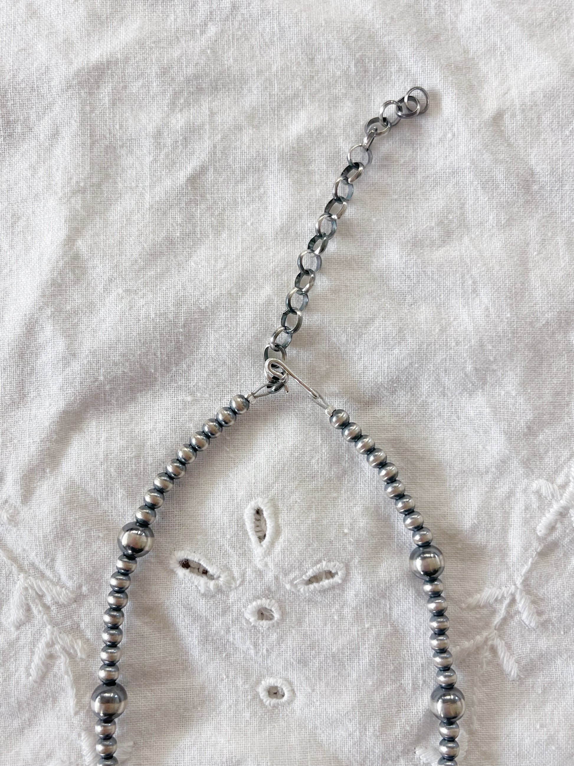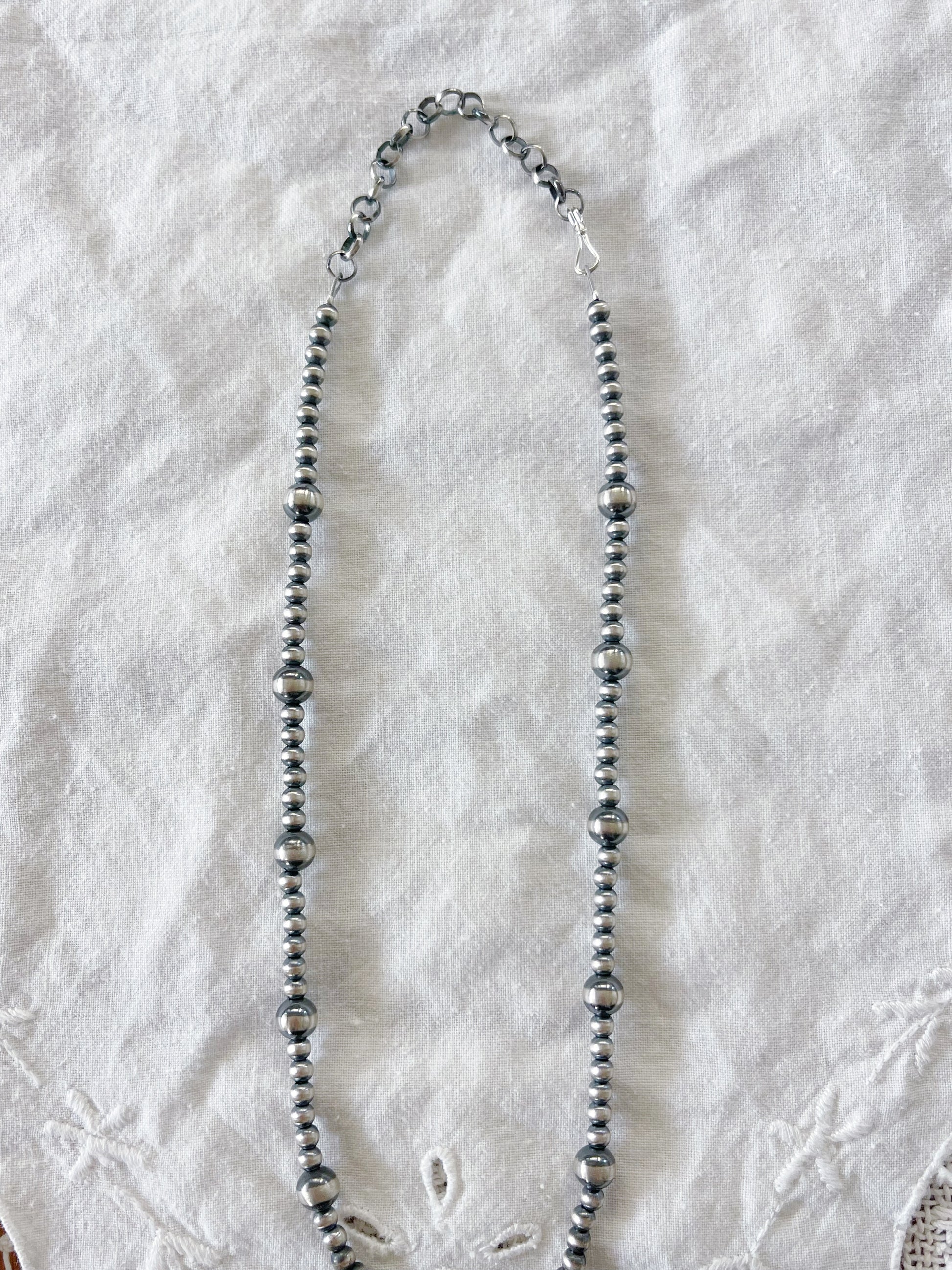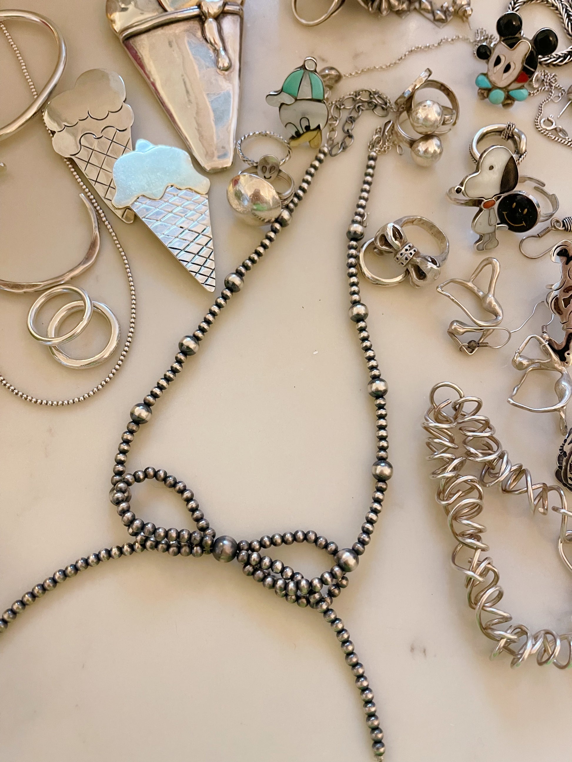 ナバホパールネックレスとはナバホの血が流れている現地の方が造り繋ぎ合わせたものが正真正銘の物で、流行ってしまうとそういった本来の製法のものではなく、シルバーのビーズをナバホの血が流れていない人が繋ぎ合わせ造ったものでもナバホパールネックレスと名乗ってしまうものが日本には多くある事を知って愕然としました...流行ってしまうとこういうことになってしまうんだなぁと.