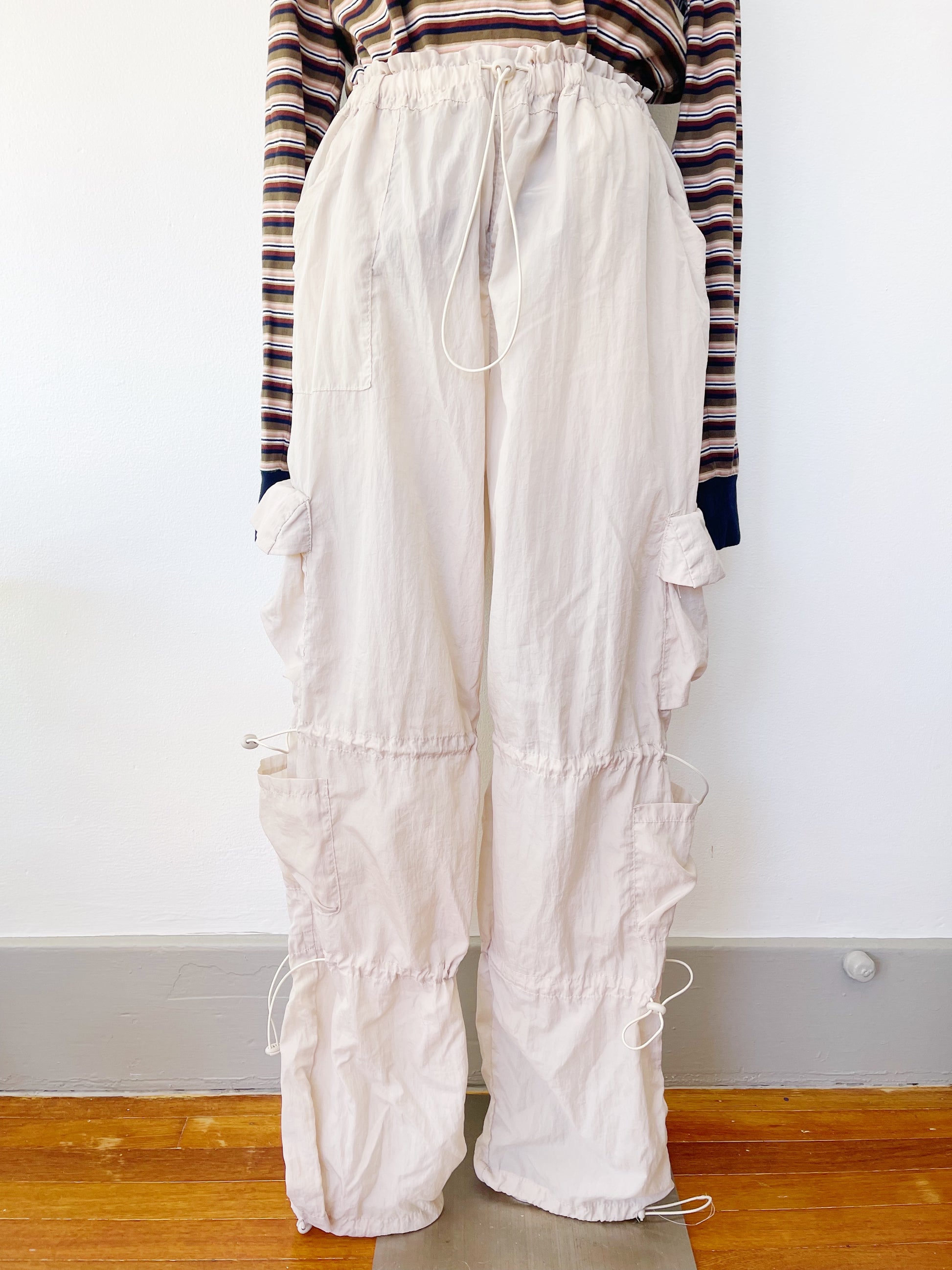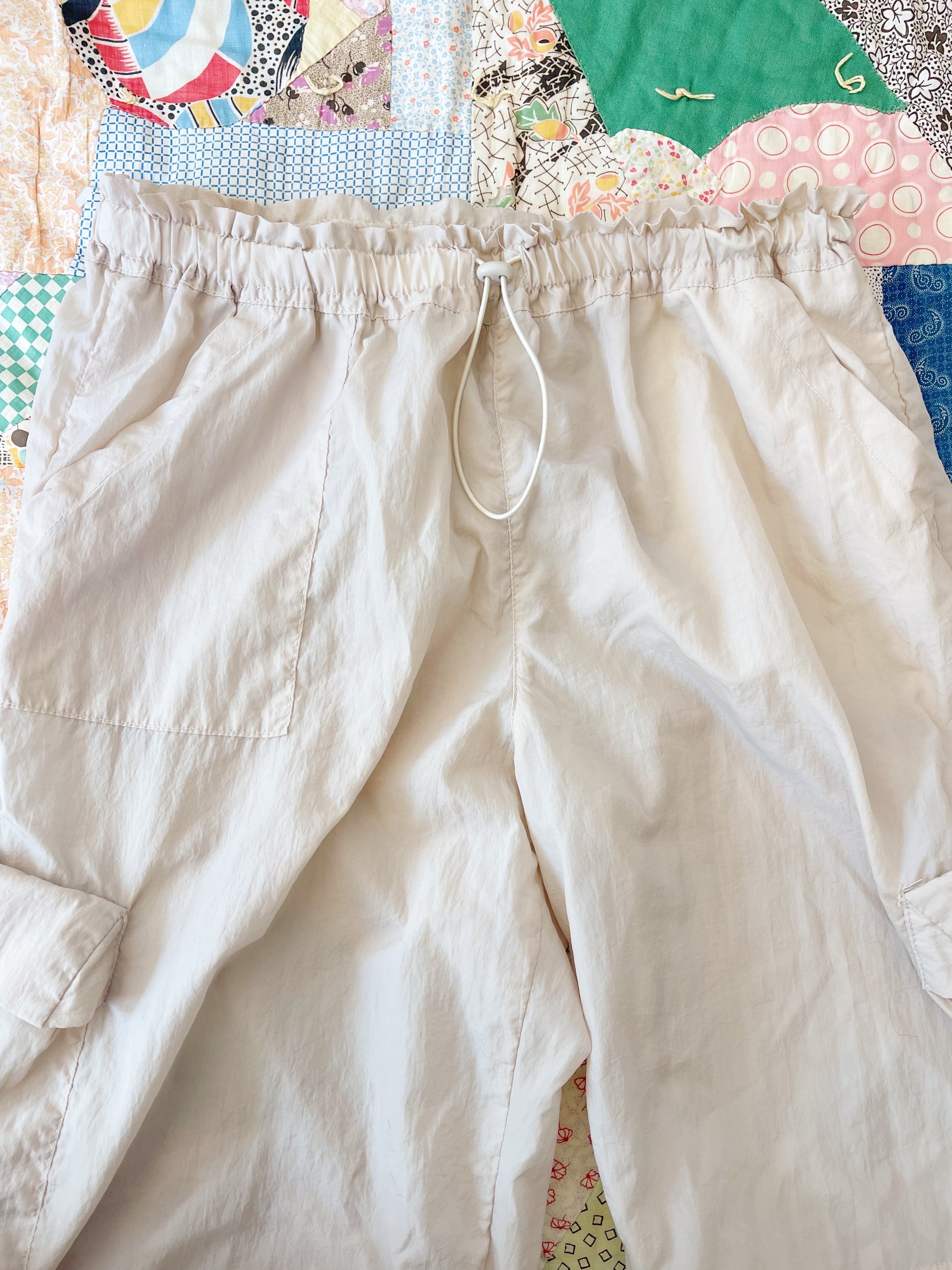 ウエスト紐でサイズを調節するタイプのパンツで、裾もきゅっと絞れるものになります☺︎