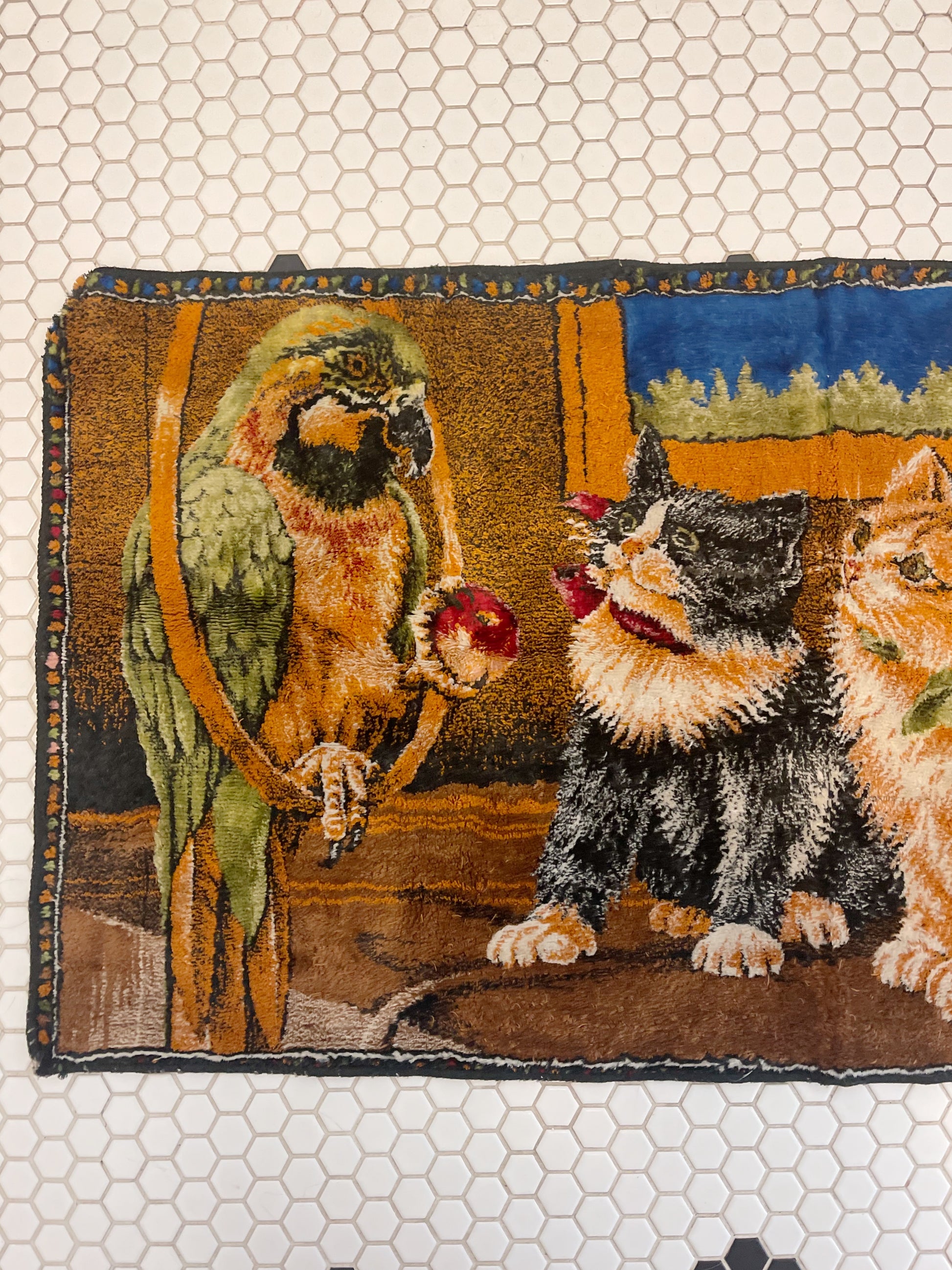 オウムと猫ちゃんたい。どんなシュチュエーションなのかなぁと考えてしまうかわいい絵柄のタペストリー。
